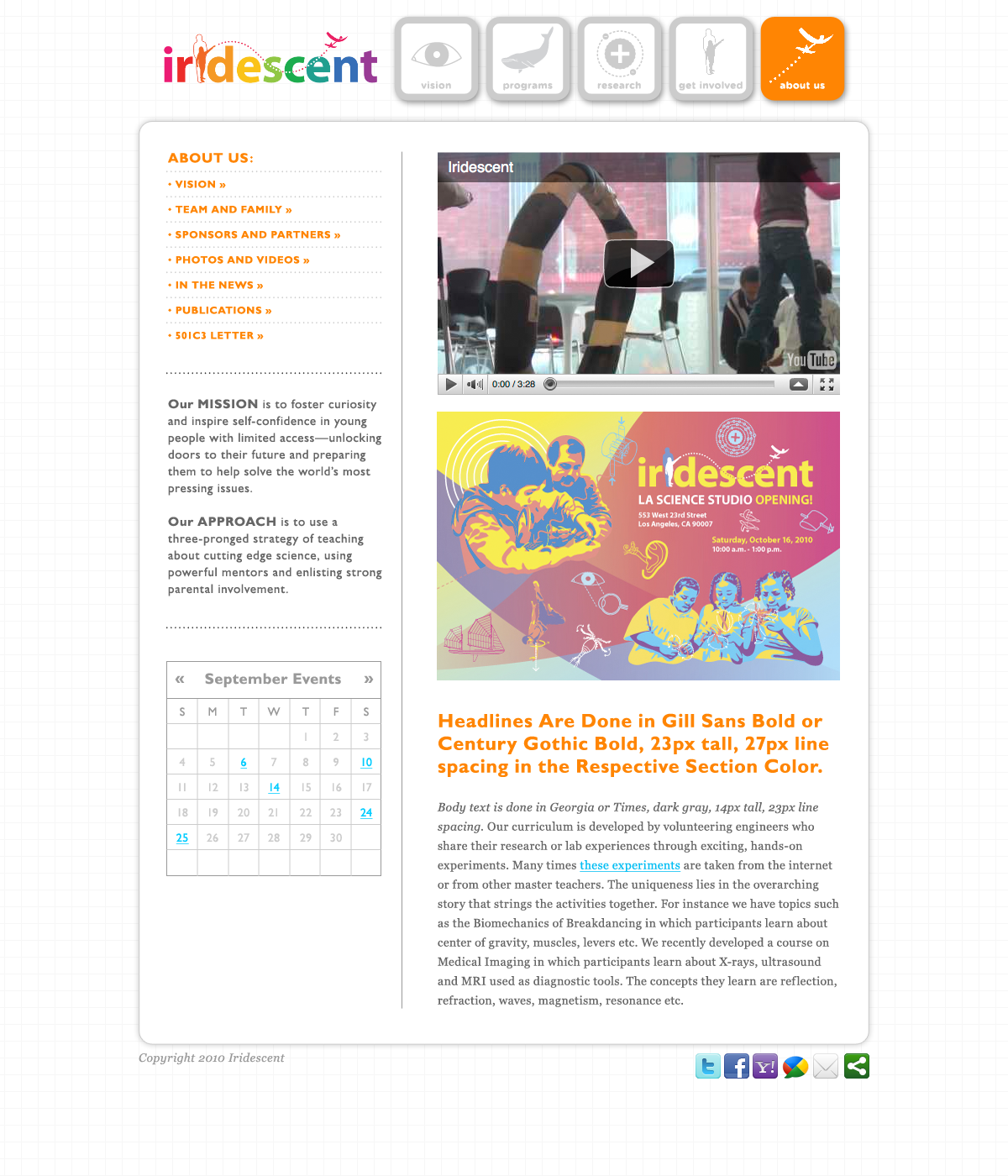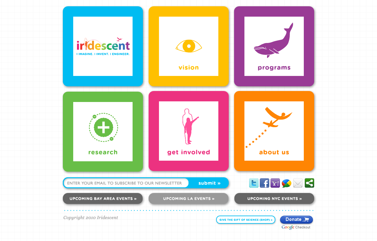 Background: Website design for Iridescent Learning, a California-based non-profit dedicated to creating fun, immersive science extra-curricular programs for underprivileged children.