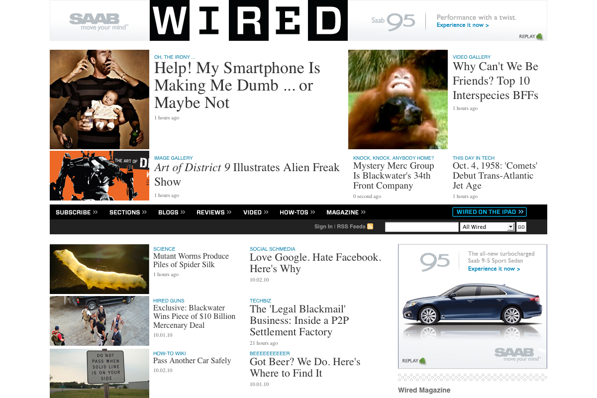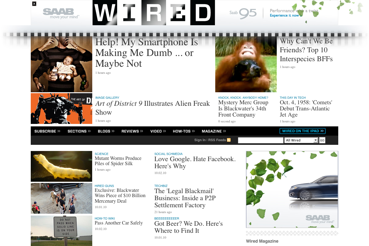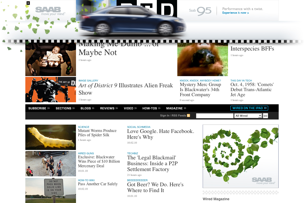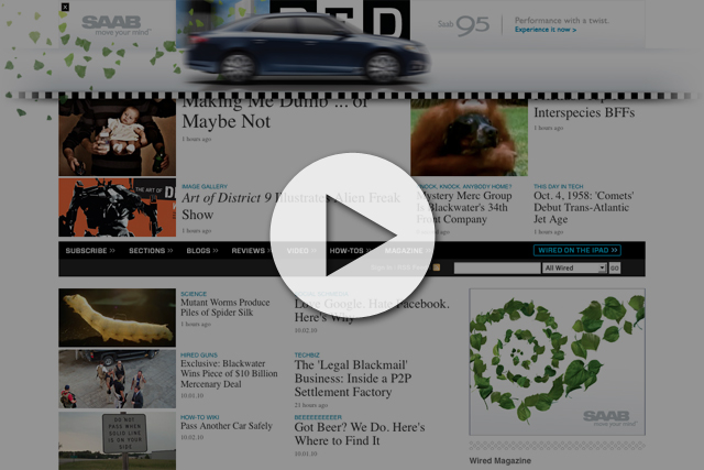 Background: Disruptive homepage takeover showcasing the Saab 9-5's speed. Design integrates the iconic WIRED logo to create an experience unique to the site.